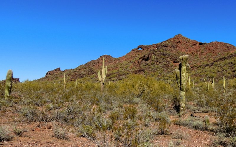View of the Arch, Eagle Eye Peak and a baby Crested Saguaro....