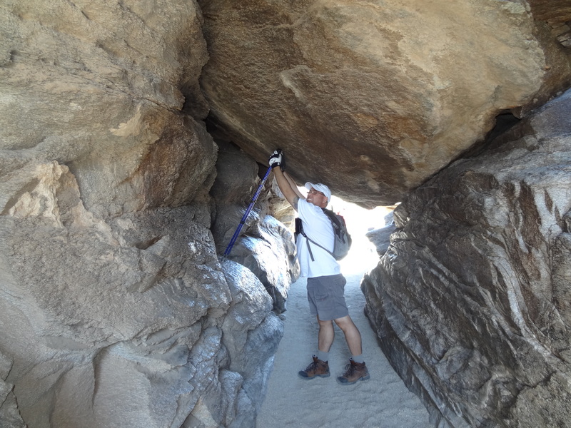 Nightstalker uses his hiking poles to prop up the overhead rock to ensure safe passage.