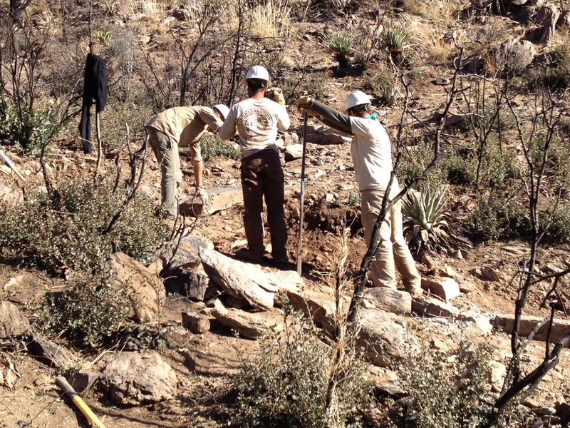 Crew placing big rock to hold the to-be-built switch backs in place. This area eroding badly after the Sunflower burn last year.