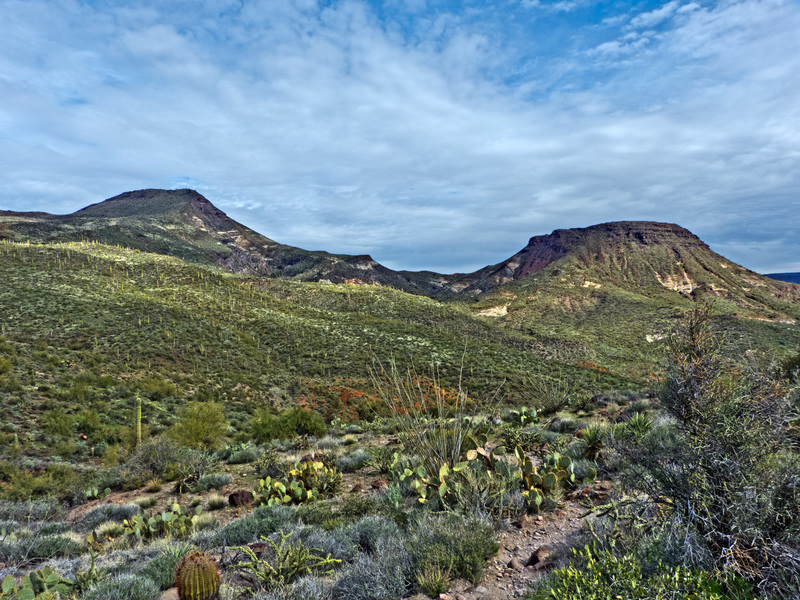 Looking back as the sun comes out to light up the greenery of the desert. Here we have Black Mesa on the left Bruce and Sugarloaf on the right. I am looking north.