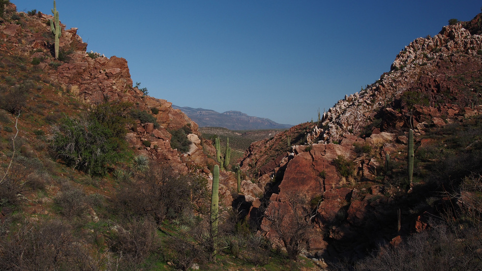 Looking at the Sierra Ancha through the notch near my camp site. A portion of the White Ledges can be seen descending into the notch on the right.