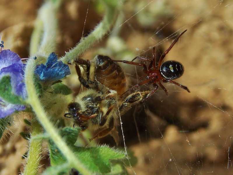 Red widow delivering the knockout blow. Red widows are rarely seen by humans and are considered to be a threatened species. There are no recorded red widow bites on humans.