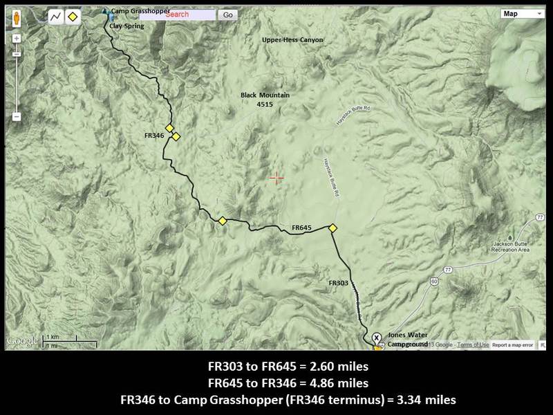 Map showing the "off-highway" route to Camp Grasshopper located by the Clay Spring corrals at the terminus of FR346...
