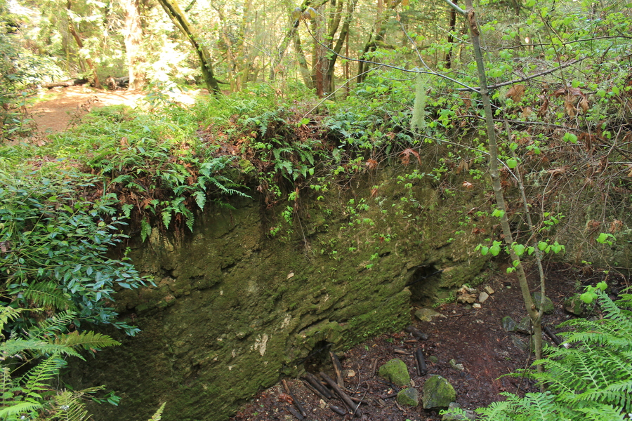 Limestone kiln. There are 3 or 4 individual kilns. Limestone was quarried about 300 yards uphill, delivered via a railcar system, then stacked so that it makes a few arches. Redwood (the old growth forest that used to be here) was placed under the arches and on top, and it burned for 3-4 days. About 70 cords of wood were used for each batch, and 6,000 cords were burned each year. California's natural resources got hit hard back in the day.