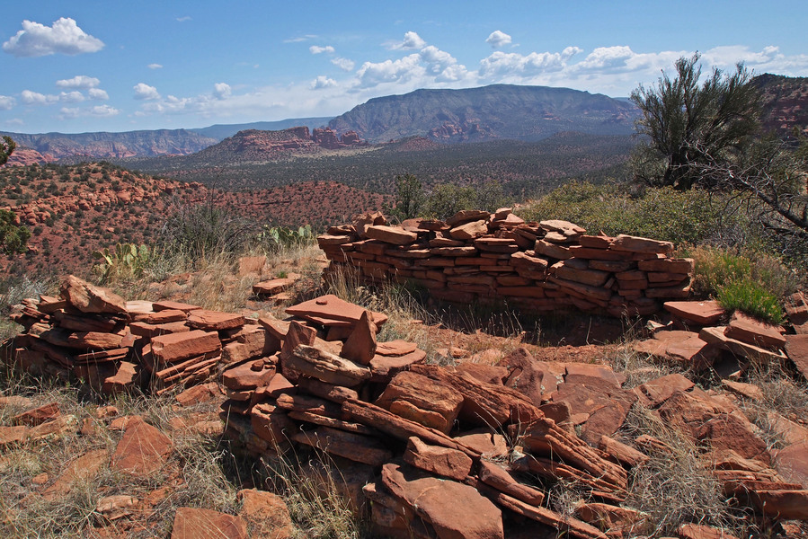 The ruins. Appears to be the remains of a rectangular building with doorway in the center of the wall on the left. Sycamore Basin in the background.