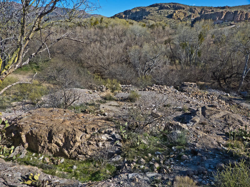 looking down on the mine remnants. See the cut (stamp pit) and the raised areas (can't remember what part of the mining operation they represented).