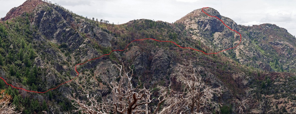Another panorama view taken from slightly higher than the previous one. The red line traces out one possible route to Sheep Mt. The final leg up Sheep Mt shown here is probably more hazardous than proceeding further around the mountain to the west side just out of sight in this picture. BobP has been up and down this side several times so I'm sure he knows the easiest route.