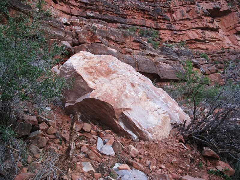 Appears to have fallen within a year based on a tree rub out of view. 3 hours prior below the Redwall we heard what sounded like a plane crash. It was likely something similar to this or one of the outlining boulders from this falling off the edge.