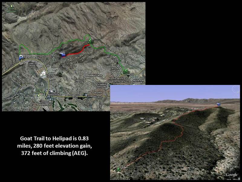 Goat Trail to Helipad is 0.83 miles, 280 feet elevation gain from the saddle (372 AEG)...