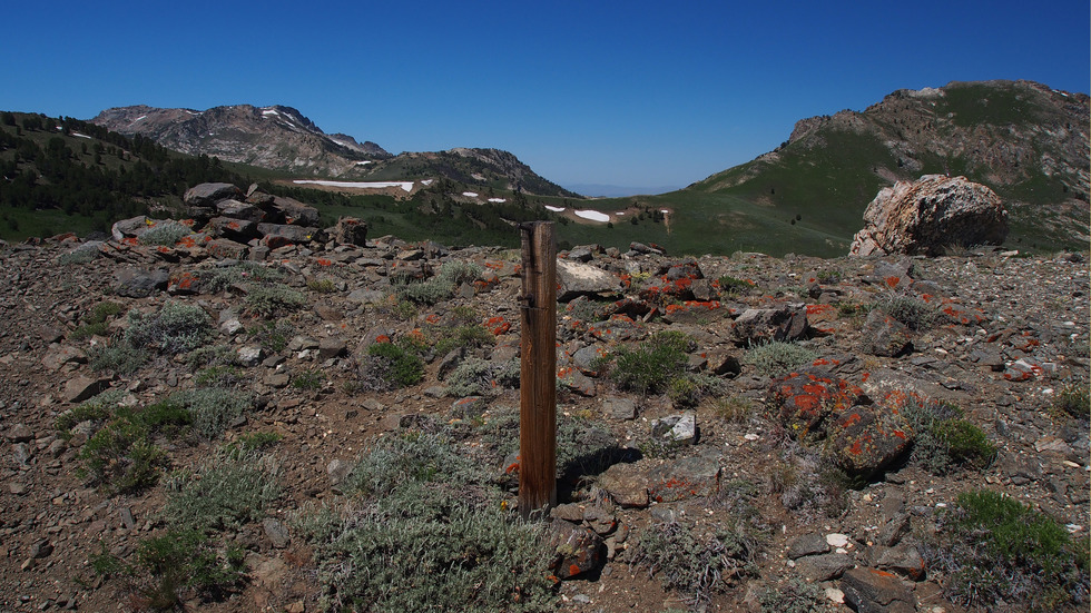 This trail sign post was in the saddle where the trail crossed over into an alpine basin at the head of Ross Creek. Would have been nice to know what info was on the missing sign. The Garmin US West map shows the Krenka Creek Trail connecting up to two trails in this basin. I chose to go off trail at this point going north along the crest of a ridge.