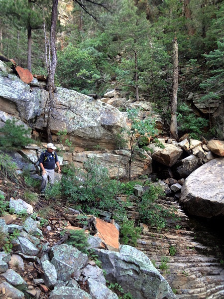 From below it looked like heading straight down wasn't too bad, but the scoot ledge is fun.