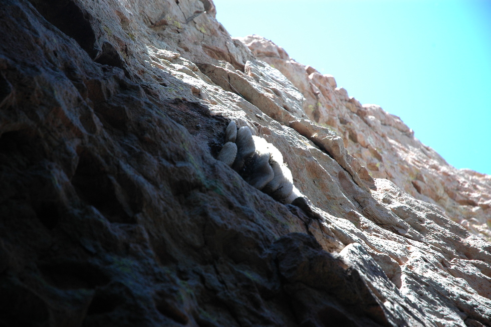 A bee hive hanging on the rocks above one of the cave entrances.