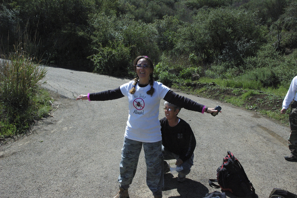I don't think that ticks can read, Monica. Do you see that clear plastic knife in Monica's hand? She gave one to each of us and wrote on each of them with a sharpie "tick flicker". A little paranoid, are we? In all fairness, we kept a count of all of the ticks we saw on our clothes and I recall the count approaching 200 by hike's end.