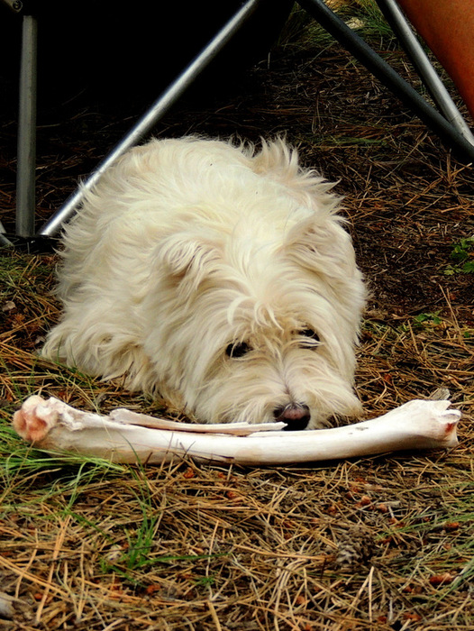 Daisy is guarding a Bone bigger than herself...And doing a fine job.....