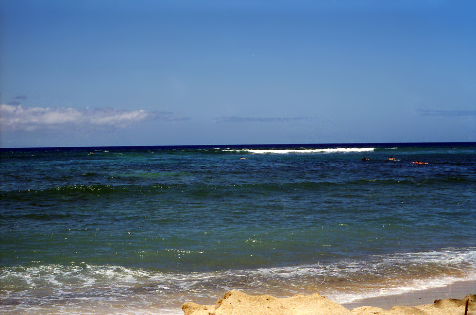 My wife was more interested in getting a sun tan than taking a photo of me surfing. So all she managed to do was get a photo of me paddling out. I had a bad sunburn, so I wore a tee shirt in the water. That's me right in the middle of the photo.