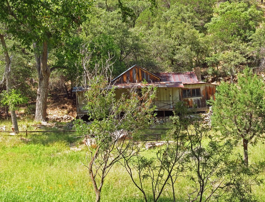 Another view of the cabin from shot 2, from across the creek.