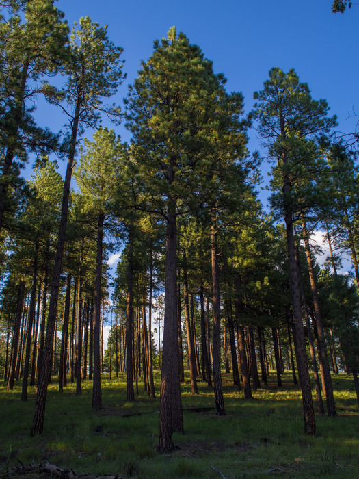 Late afternoon sun shining through the pines.