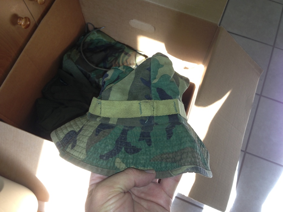 I bought this hat in October, 1981, for SFQC Phase 3 "Robin Sage" at Camp Mackall, NC. (I was support, not actually in SFQC.) I used the band to store my P-38. The stain is from ham & eggs c-ration. Many, many miles on this boonie hat, as I wore it for 20 years -- unwashed, because that would have washed out the good luck. Must have worked, because I'm still here. It is one of my most cherished posessions. I thought it was lost forever, until some cleaning this morning.