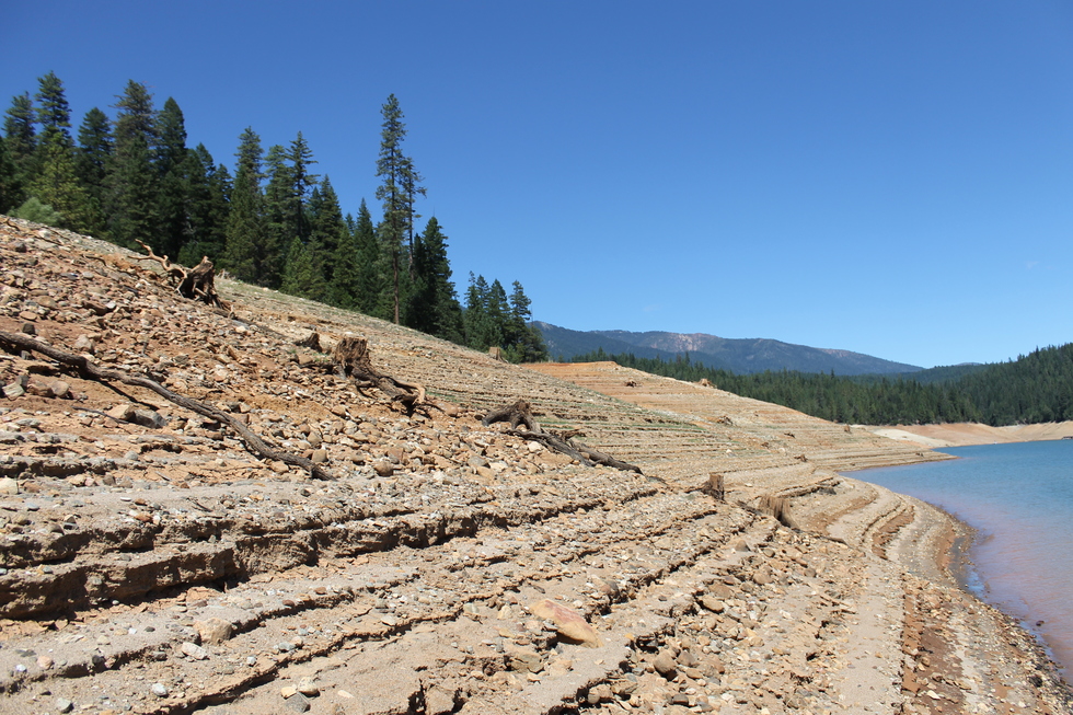 We hiked down to the lake and walked along it the day after the hike. The soil is either very loose or mud down here. Trinity Lake is way down because it's the upper basis of the northern Central Valley's plumbing, and it's late summer.