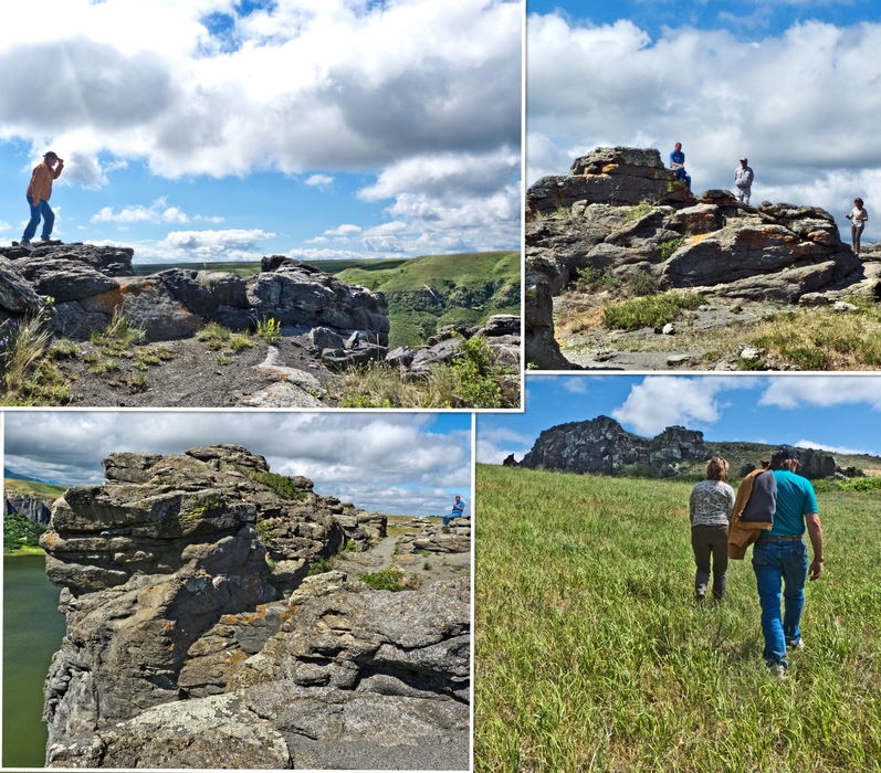 Cousin Brian doing his Lewis and Clark imitation; something we find popular to do being from Montana and all. Other photos around the rocks. LR is Cathy and Brian as we head up a break after checking out how far down we could go before being cliffed out.