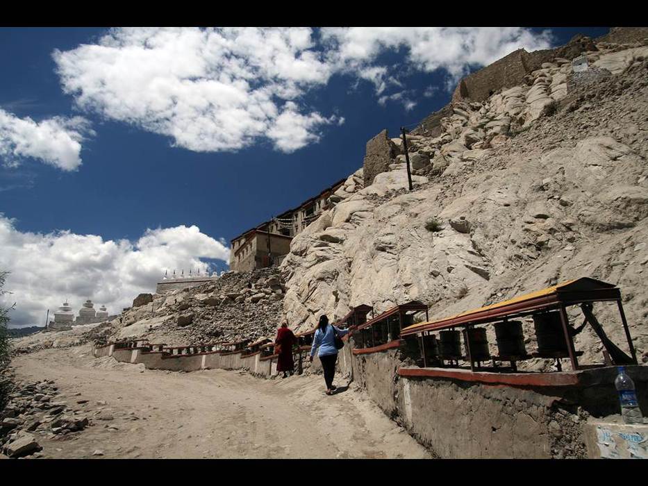 Lama Palden leads the way up to Shey Palace and Monestary spinning the prayer wheels...