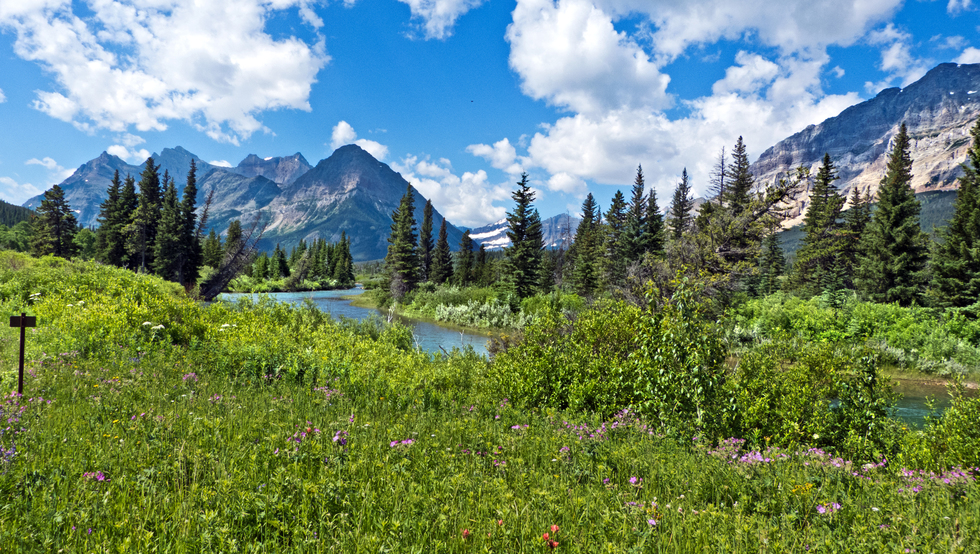 along the Belly River as we reach an intersection to Gable Mtn (not in picture). There is also a ranger-guided hike out there. Mtns l to r: Nataos, Merritt behind with Cosley Ridge in front, Cathedral with snow stripes. Lots of sticky geranium in foreground.
