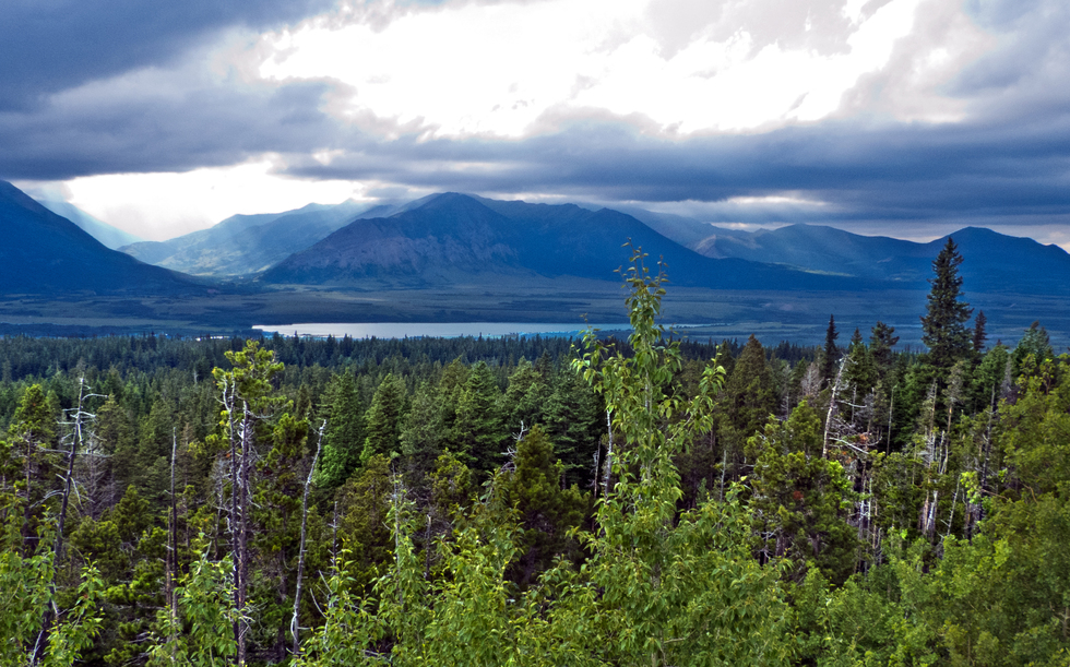 Looking from Hwy 6 NW at Bellevue Hill overlooking Muskinonge Lake. To the right of the lake is Dungarvan SE2 and Lakeview Peak is to the far right. I was able to get a little of the sun rays on the valley between Bellevue and Mount Crandell on the far left. Next to Crandell in the far background is Mount Blakiston.