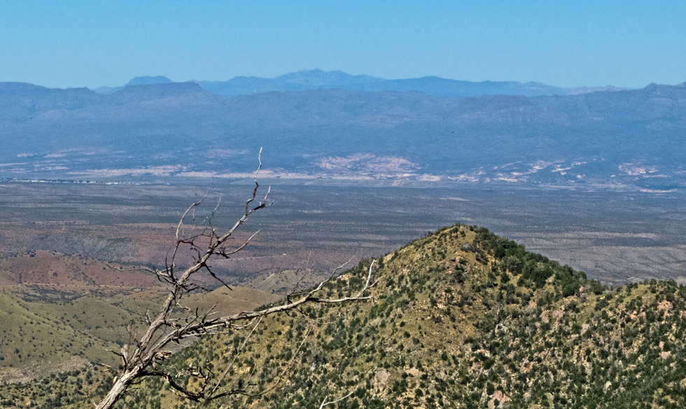 Zooming to what I think is north but it is east. You can seen San Manuel off to the left I think. As I am trying to identify the larger mountain in the background, I found Power Gardens. Always wondered where that is. Anyway, I think the mountain range in the background is the Santa Theresas and the double hump mountain could be Mount Turnbull. The mountain range in the far, far background is the Pinalenos?
