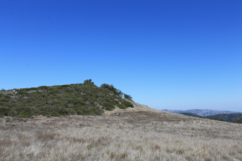 Typical grassland of the highest parts of Marin County and much of the Coast Range to the north. This area is un-grazed because this is part of Marin County's municipal watershed so the grass grows naturally. Grassy areas transition to chaparral which transition to smatterings of timber.
