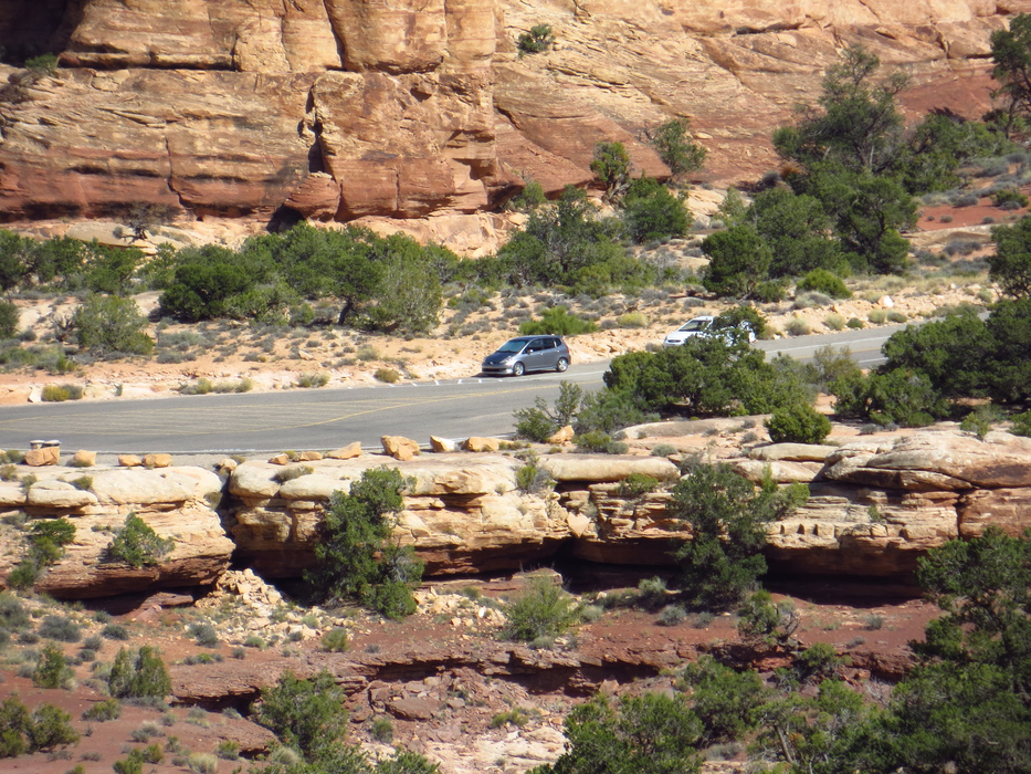Full zoom of the previous photo of the trailhead. Tracey's Honda Fit is in the center. We still have 200' of descents and 250' of ascents before we reach it.