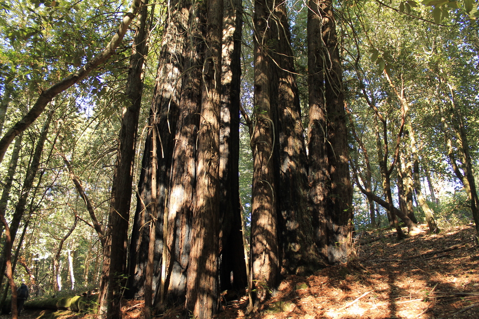 I apologize for the poor quality of this picture, but this is a great example of a ring of second growth redwoods. The original tree was probably turned into shingles by the Johansen Mill. Then the trees here presently sprang from the roots. These things are crazy, and basically immortal.