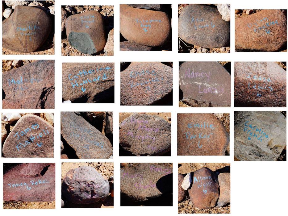 From top, L-R: Charlotte Bacon, Olivia Engel, Josephine Gay, Ana Marquez-Greene, Dylan Hockley, Madaleine Hsu, Catherine Hubbard, Chase Kowalski, Nancy Lanza, Jesse Lewis, James Mattioli, Grace McDonnell, Anne Marie Murphy, Emile Parker, Caroline Previdi, Jessica Rekos, Lauren Rousseau, Mary Sherlach, Allison Wyatt. 7 others, but the rocks were faded so we couldn't see their names.