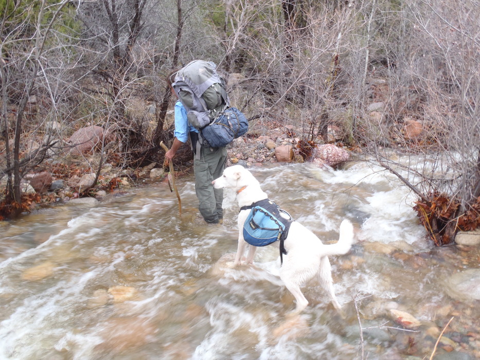 Blanco following us on rocks.