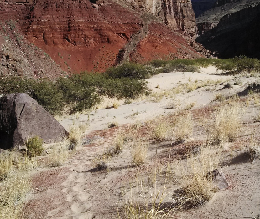 Our footprints in the sand dunes on the way to the Tonto, coincidently nicely aligned with the diabase dike