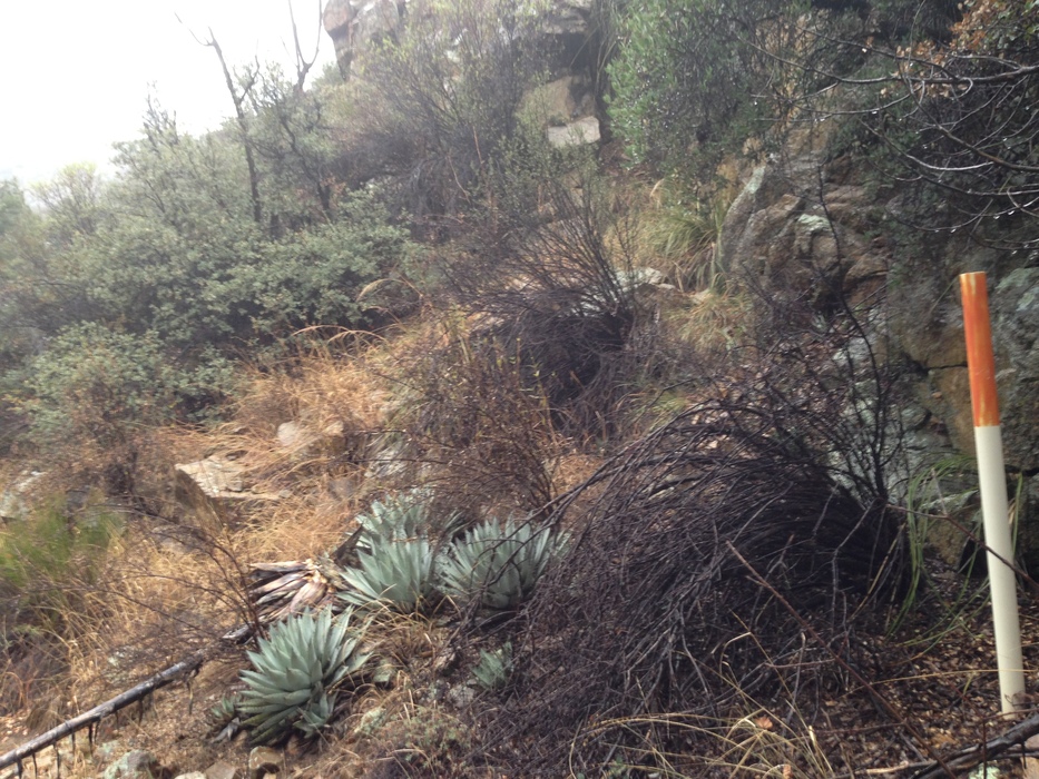 Claim stake down in Board Creek. This is not part of RT's claim ( http://hikearizona.com/photo=370753 ), which is further down canyon. It was signed, but I did not want to take an audio note as my iPhone was getting wet enough as it was, and I did not feel like buying another new one two months after replacing the previous drowning victim ( http://hikearizona.com/photo=364905 ).