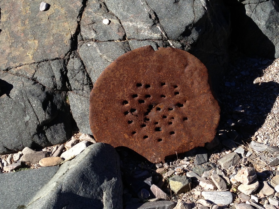 I thought at first it was a stone disk with metate depressions in. Then I realized it was metal, and figured someone had used it for target practice. But the holes must have been punched, because they are rectangular. Best I can figure is that maybe some used it for a grill top on a camp fire.