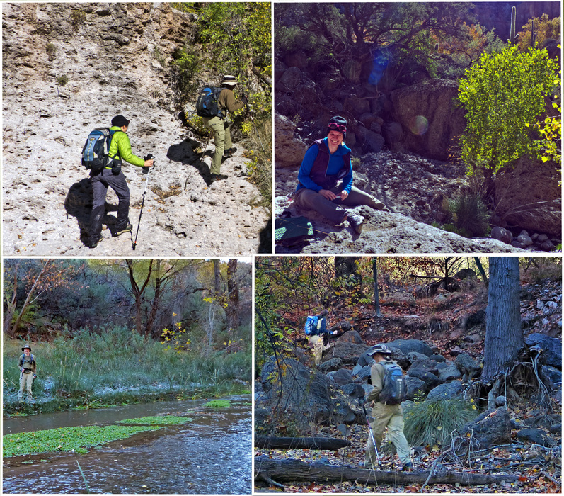 UL is Diane and Todd as we seek out Karl somewhere above us in Booger Canyon. UR is Kathy at her lunch spot in Booger Canyon. LL shows the frost on the ground as Todd gets ready to cross Aravaipa. LR is going into Booger Canyon with Linda and Todd.