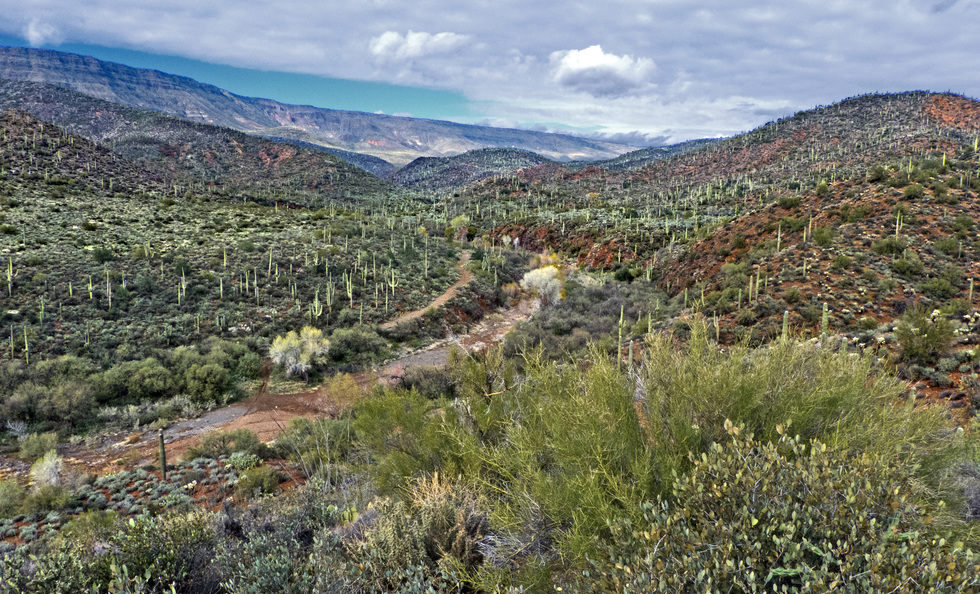 Cave Creek. You can see the Spur Cross trail below next to that bushy Cottonwood tree ahead. I had hoped we would have came out there so that we could loop back via the Metate but we came out on the road further up (south in this case).