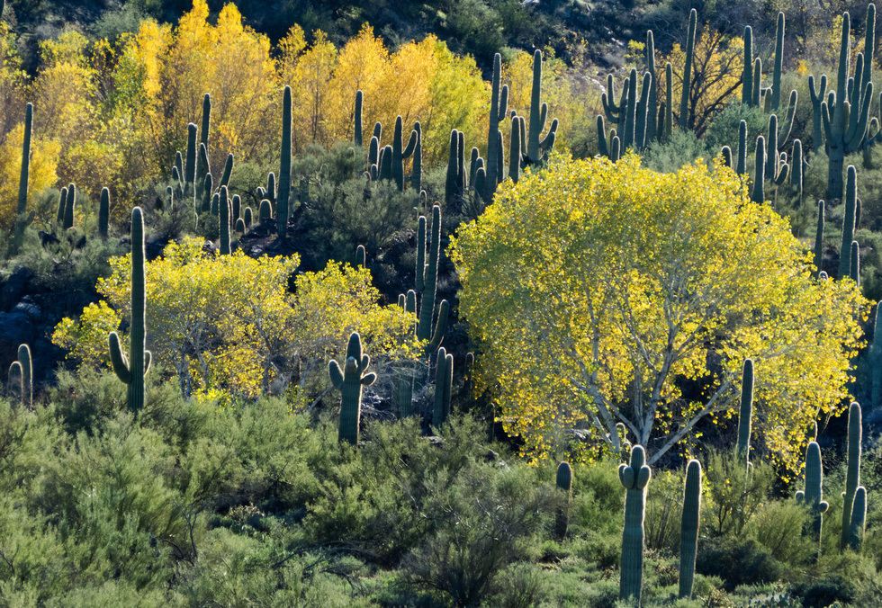 saguaros and cottonwoods all lit up for Christmas.