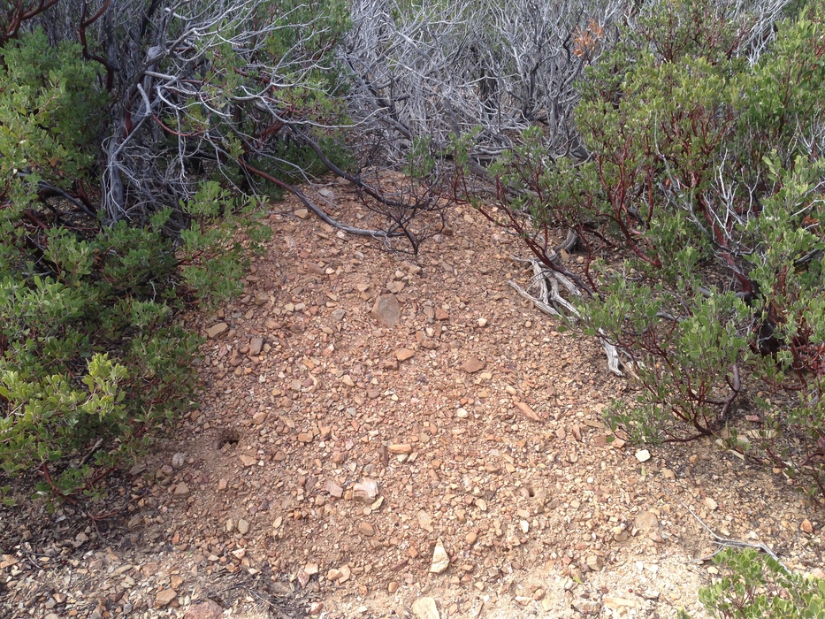 The ground was mostly whitish rocks, but this six inch hile pile was reddish. It's about person-sized, so maybe this is the grave? I did not find a marker.