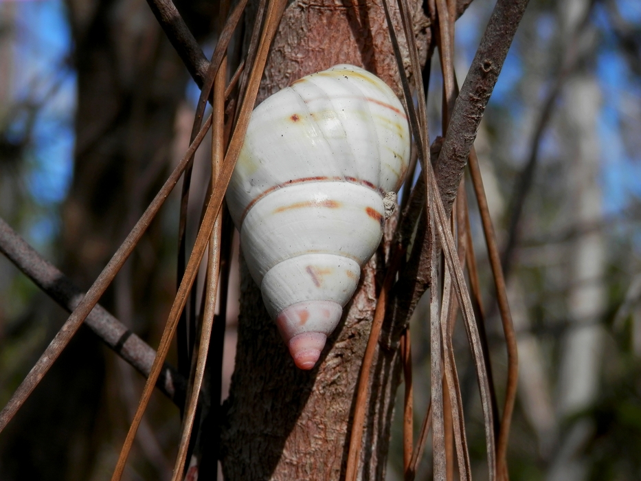 Rare and Endangered (so I was told) tropical tree snail. It hibernates in the dry season by attaching to trees and is active in the wet season. If you pull it off the tree during hibernation, it dies. Endangered due to poaching and habitat loss.