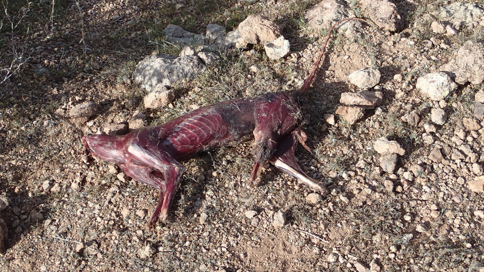 Thoroughly skinned and head-less fox? I didn't see it when I passed by four hours ago and there wasn't even a fly on it yet so I had to wonder who left it and why.
