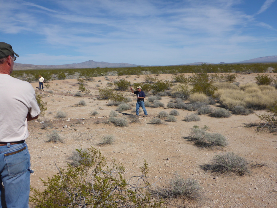 John, our tour guide from the Chamber of Commerce, at the Camp Bouse boxing arena. A circular berm surrounded the arena, with rows of wood benches between each wedge (the dark gravel lines). Buckskin Mountains on the left; Harcuvar Mountains on the right.