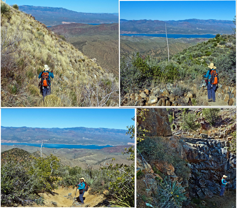 Ambika collage: UL working our way down to the TH through this pretty golden grass section. LL & UR coming down a nice part of the trail with those awesome views again. LR Ambika below the dry falls that makes its way toward Buckhorn Creek.
