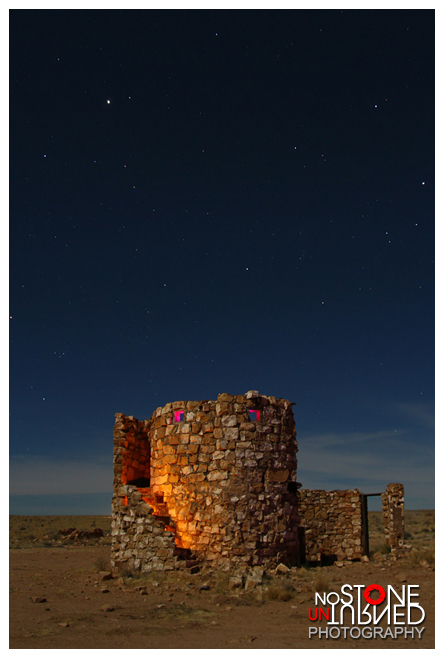 Shot at a windy 34° under the full moon around midnight at the end of a 18hr photo exploring day, as a police officer was checking out my parked car in the distance. 4 amber gelled lights faced backwards wrapped in white plastic bags, 4 blue and 2 red gels @ 20seconds (my max time because I loath star movement).