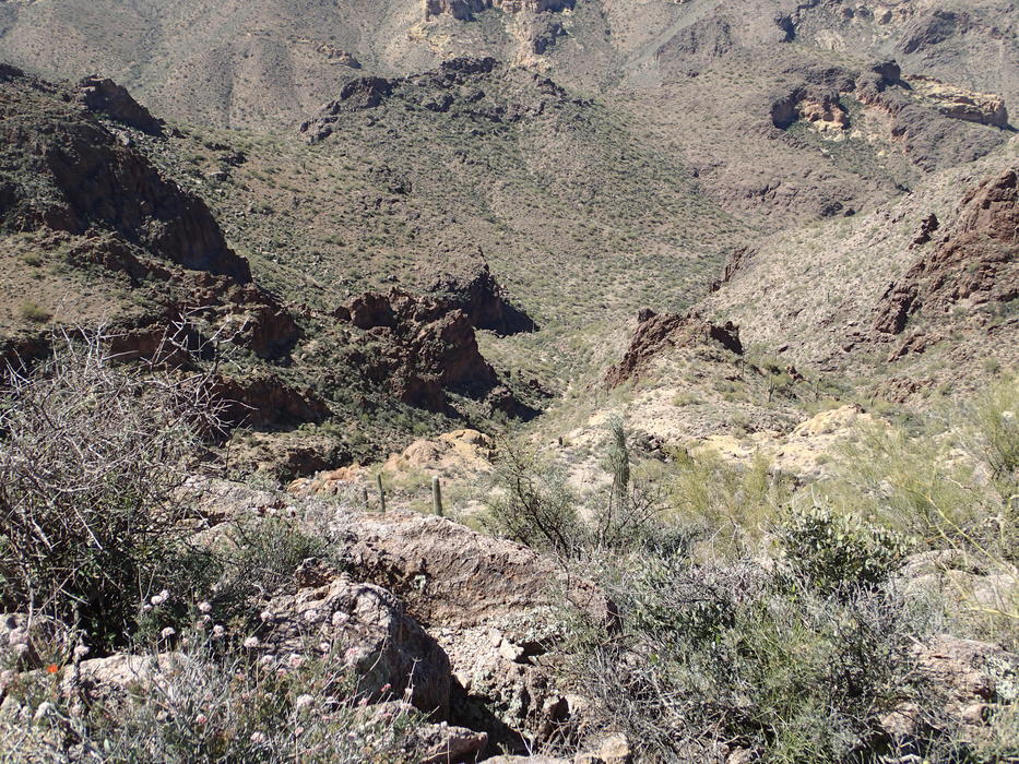 The canyon where we sought an ascent route two days ago. We were stopped by a sheer cliff face not visible in this view.