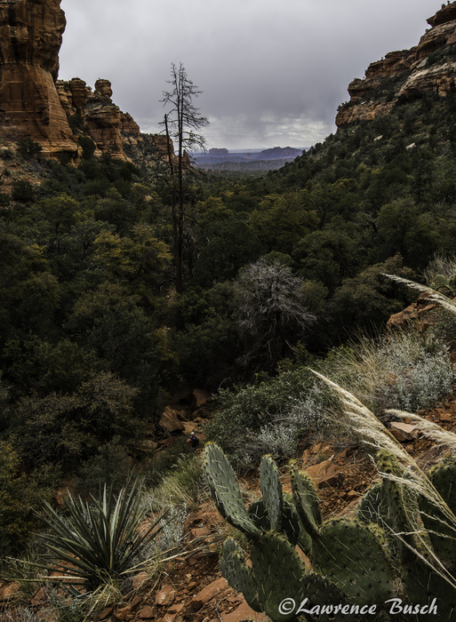 Interesting diversity of cactus, evergreen and red rock along with a nice view of the valley below.