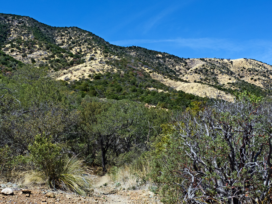 looking back (west) at the mountains that rise above us with the golden grass and green bushes and trees.