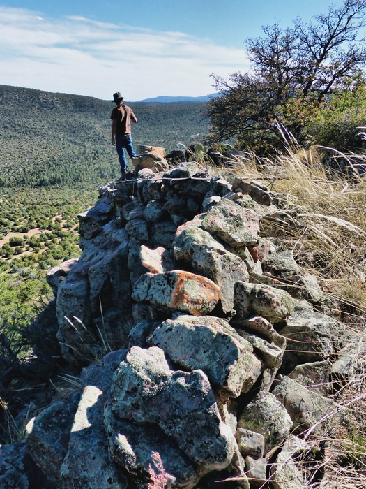 Brian stands at the edge of one of many terraces just off the top, rocks cleared and stacked, small for crops, not sure what for. Found pottery shards in these areas too.