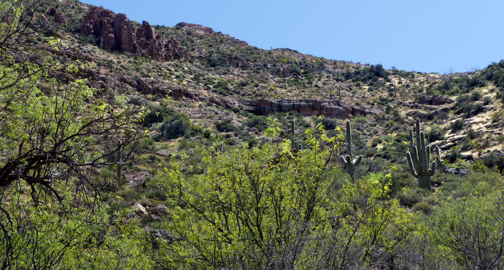 on the other side of the creek was another cool rock outcropping, a bunch of blooming ocotillos slightly out of view and a pour off over on the right. Now the question is, is Fraser Canyon just over on the other side? Seems to be based on the topo but perhaps a bit further then one would think.